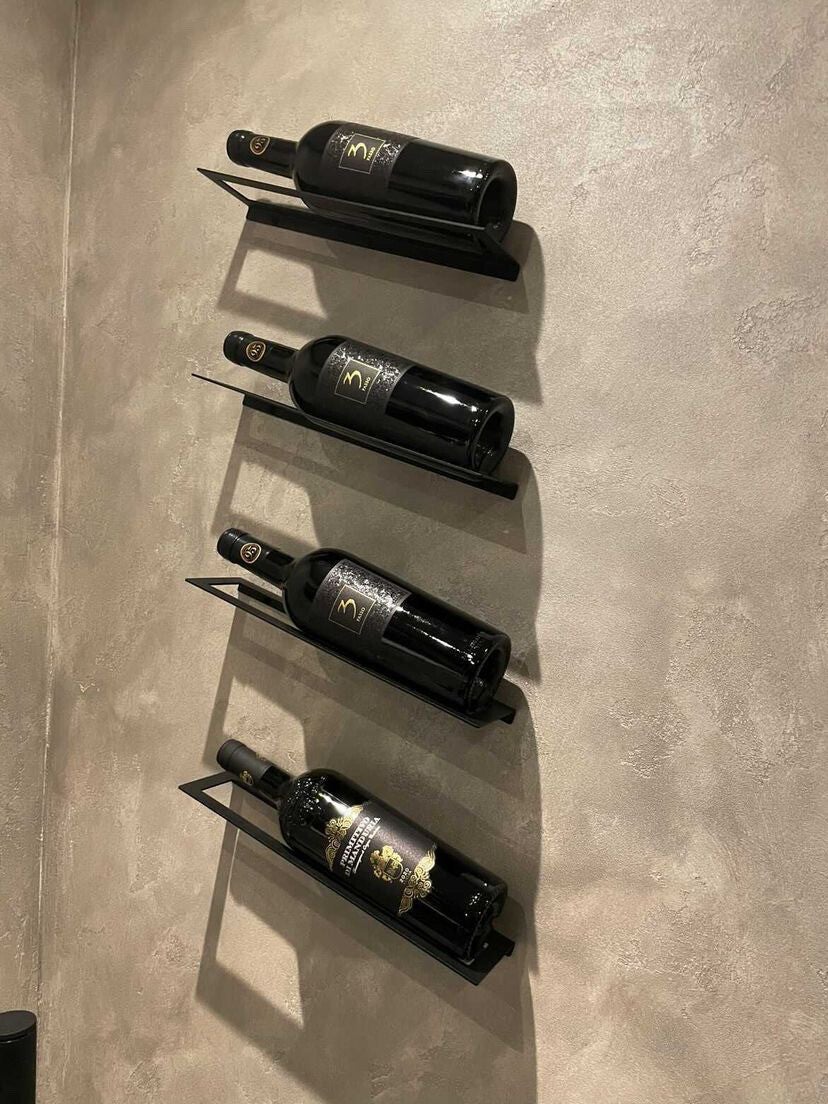 De afmetingen zijn: 33 cm x 8,8 cm x 1,5 cm (BxDxH). Voor elke houder boor je twee gaten. De houders zijn zeer simpel en snel op te hangen met behulp van de beschrijving. Deze wordt samen met het bevestigingsmateriaal bij u thuis geleverd. Het bevestigingsmateriaal bestaat uit zwarte schroefjes en pluggen. Met 10-15 cm afstand tussen elke wijnhouder krijg je het mooiste resultaat (vinden wij).